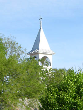 Church steeple off in the distance.